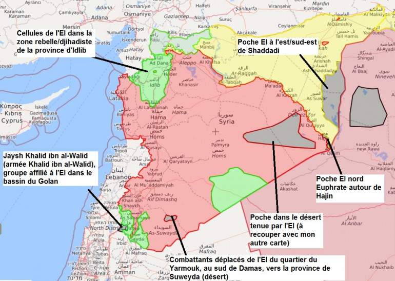 Deux poches se trouvent près de la frontière irakienne, une troisième dans la région désertique entre Homs et Deir Ezzor, et une poche maîtrisée par l'armée Khalid Ibn al-Walid, qui a prêté allégeance à Daesh en 2016, à la frontière avec le Golan.