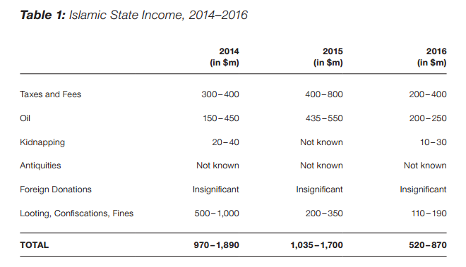 Malgré des chiffres exacts extrêmement difficiles à obtenir, les spécialistes estiment ainsi que la richesse de l'État islamique est passée de 1,9 milliard de dollars (1,8 milliard d'euros) en 2014 à 870 millions de dollars en 2016.