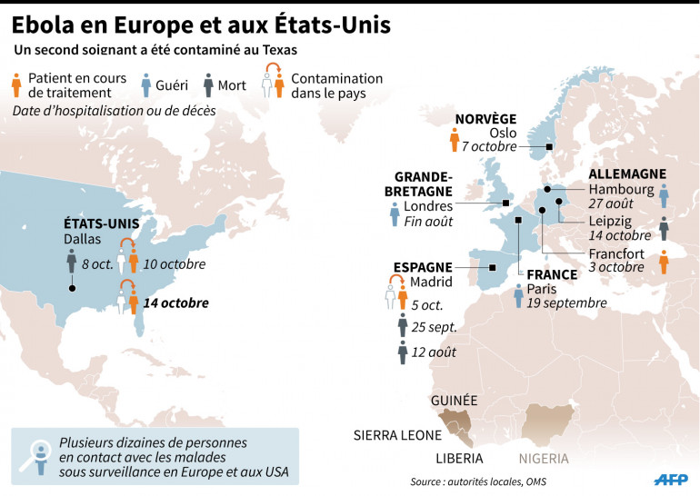Aux États-Unis, deux membres du personnel soignant ont été infectés dans un hôpital texan où un patient libérien, de retour de son pays, est mort du virus. L'Espagne connaît un cas d'infection, une aide-soignante qui s'était occupée de deux missionnaires infectés et rapatriés à Madrid où ils sont décédés en août et en septembre.