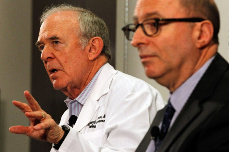 Les docteurs Edward Goodman et Mark Lester lors d'une conférence de presse au Texas Health Presbyterian Hospital de Dallas, où le premier cas d'Ebola a été diagnostiqué hors de l'Afrique.