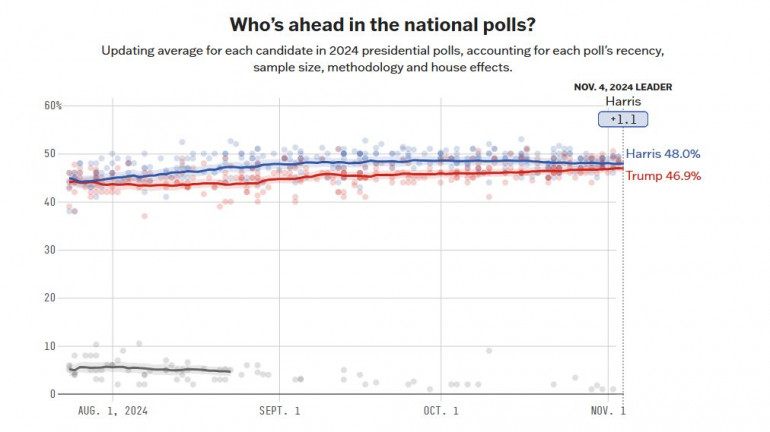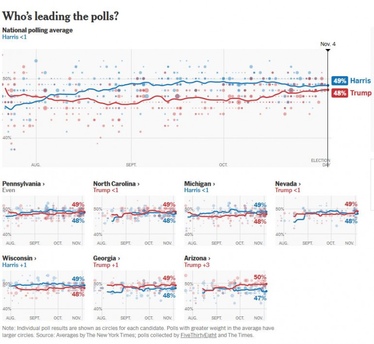 Le New York Times, ce 4 novembre, annonce le même résultat (49% pour Kamala Harris contre 48% pour Donald Trump). Depuis la mi-octobre, Donald Trump regagne quelques précieux points et talonne la vice-présidente. De quoi redonner de l'espoir pour les fans du style "Make America Great Again" et inquiéter celles et ceux qui ne supportent pas le style de l'homme d'affaires. Un suspense qui pourrait aussi motiver les électeurs qui ne comptaient pas forcément se déplacer aux urnes pour pouvoir peser dans la balance.