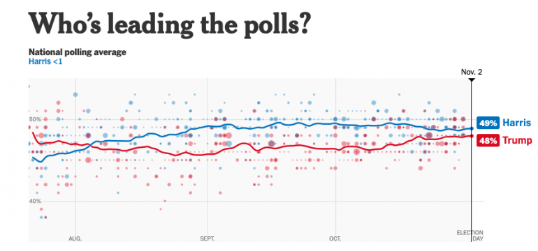 Le New York Times, ce 2 novembre, maintient cette courte avance pour Kamala Harris (49% contre 48% pour Donald Trump). Les courbes sont plus proches que jamais mais elles ne se croisent pas pour le moment. La dernière fois que Donald Trump était en tête dans les sondages, c'était cet été. Kamala Harris a pris le dessus au début du mois d'août 2024 pour ne jamais céder cette place de fragile favorite depuis.