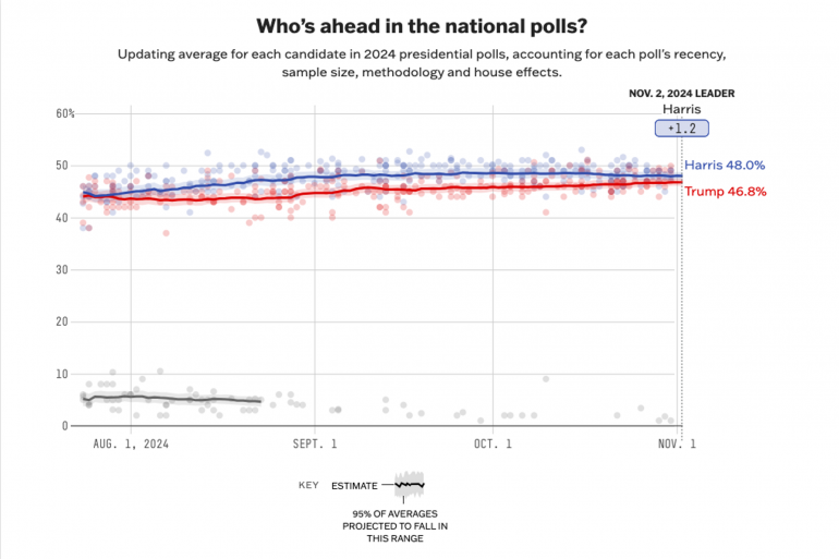 Le site spécialisé FiveThirtyEight, qui agrège les différents sondages réalisés aux États-Unis, donne toujours une légère avance à la vice-présidente actuelle, Kamala Harris. Elle est en tête des sondages nationaux avec 48% des voix projetées, contre 46,8% pour Donald Trump.
