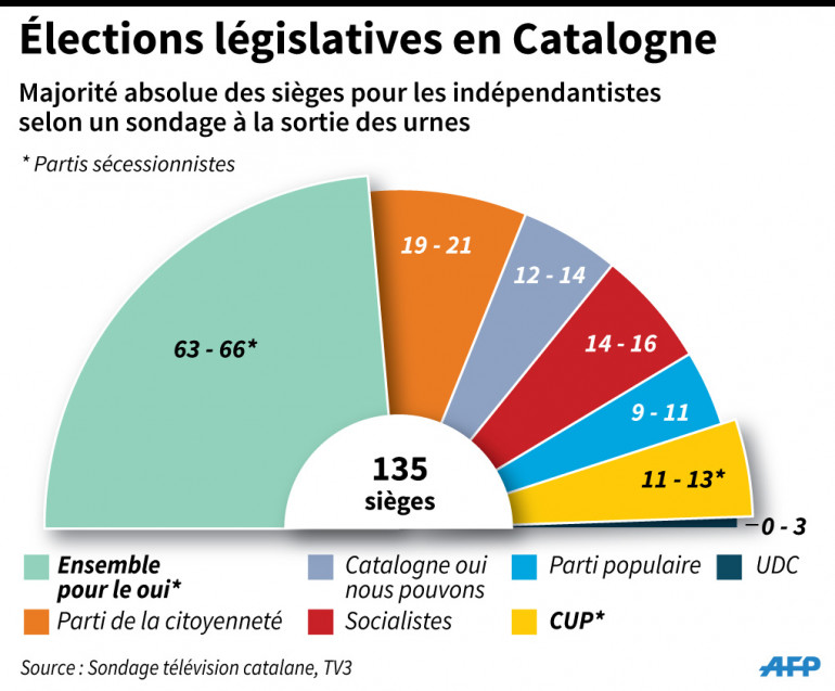 Dimanche 27 septembre, les Catalans étaient appelés à voter lors des élections régionales. Ce sont les indépendantistes qui apparaissent comme les grands gagnants du scrutin. La coalition "Junts pel Si" (Ensemble pour le oui), rassemblement de la droite et de la gauche en faveur d'une scission de la Catalogne, sort des urnes avec 62 sièges et 39,6% des voix. En s'alliant avec la CUP, qui obtient 10 sièges et 8,2% des voix, les indépendantistes catalans arriveront à la majorité absolue fixée à 68 sièges.