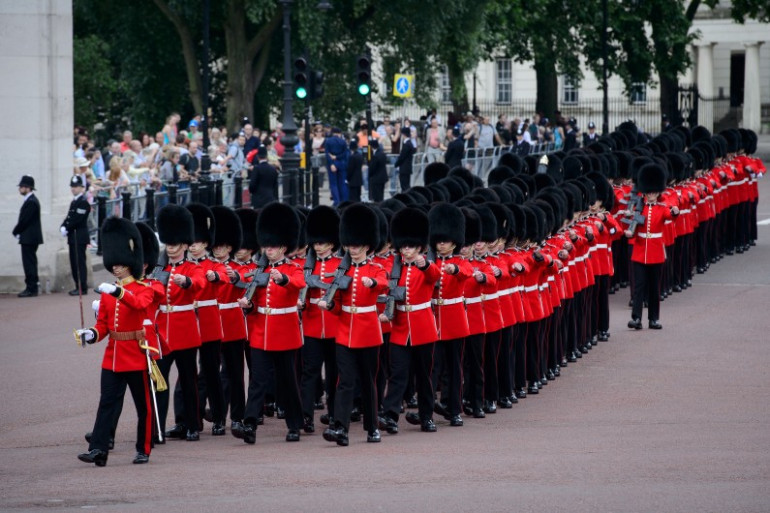 Les troupes de la "Queens Guard" défilent devant Buckingham Palace, le 14 juin 2014