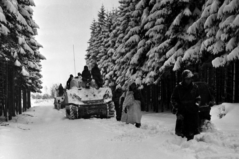 28 janvier 1945, près d’Heersbach (Belgique) : des parachutistes du 504e régiment d’infanterie de la 82e division aéroportée avancent dans la neige lors de la Seconde Guerre mondiale.