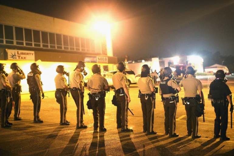 Des policiers postés dans les rues de Ferguson, aux États-Unis, pour maintenir le couvre-feu, le 17 août 2014