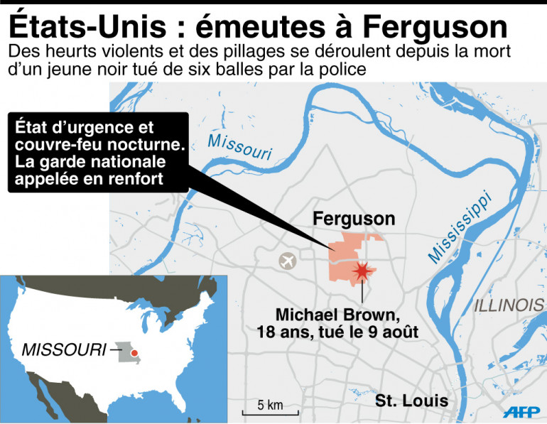 Carte de localisation de Ferguson, dans la banlieue de Saint-Louis, où a été abattu un jeune Noir par un policier (18 août 2014)