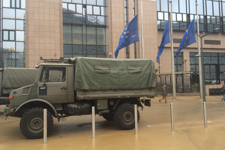 Un camion de militaires assure la sécurité devant la Commission européenne à Bruxelles, où les drapeaux sont en bernes
