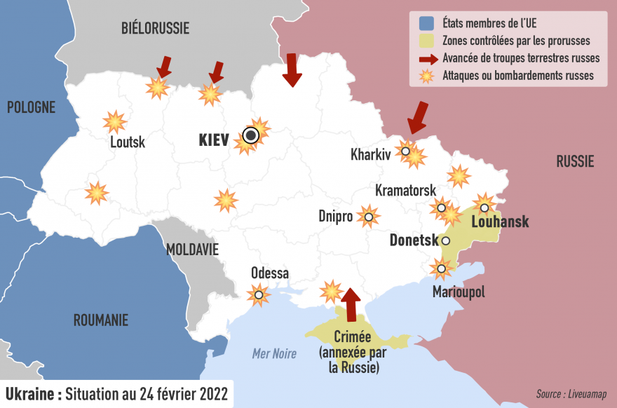 La situation en Ukraine le 24 février 2022 (Source : Liveumap)
