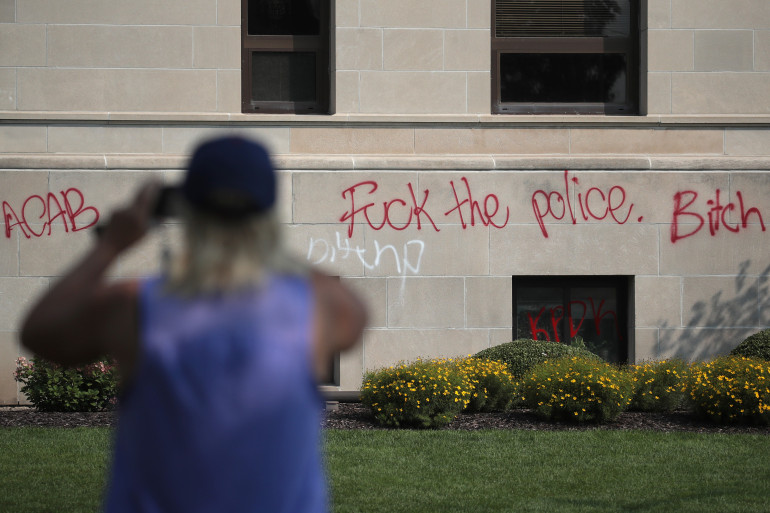 Un tag contre la police sur la palais de justice de Kenosha (Wisconsin, États-Unis) le 24 août 2020