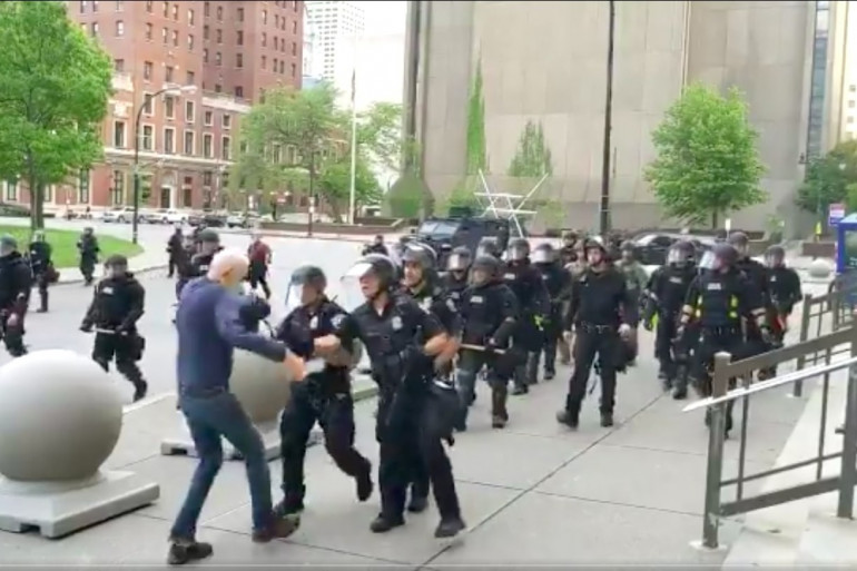 La vidéo, dont les violentes images peuvent heurter, a été tournée par un journaliste de la radio publique américaine NPR. On y voit un homme âgé se diriger vers un attroupement de policiers en armure se faire violemment pousser au sol, avant de tomber à la renverse et de saigner abondamment de la tête. À la suite de sa chute, un agent tente de lui porter secours, mais un autre l'en empêche, lui conseillant visiblement de continuer son chemin comme si de rien n'était.