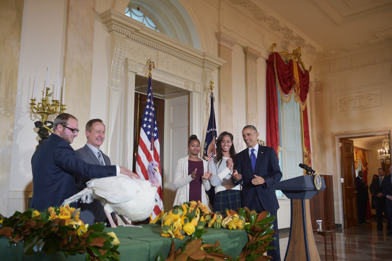 Obama et ses filles lors de la cérémonie de Thanksgiving 2014