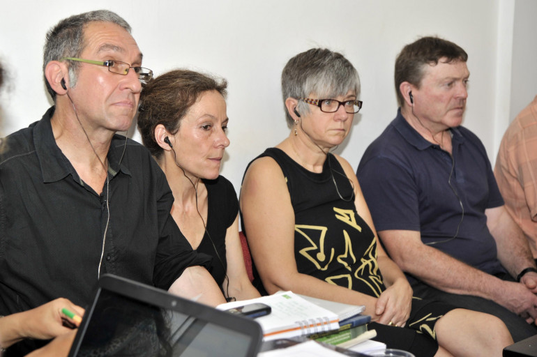 Les parents de Jérémie Bellanger et ceux de Fannie Blancho, lors d'une audience au tribunal de Trinidad, le 27 février 2014 (archives).