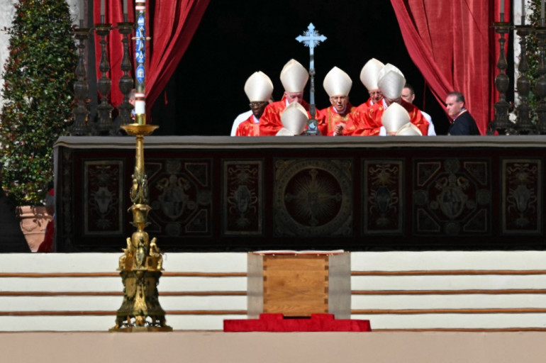 À gauche de l'autel, dans un ordonnancement tout aussi géométrique, 255 cardinaux et 750 évêques et prêtres, revêtus de rouge ou de violet, ont suivi dans le plus grand recueillement la messe présidée par l'Italien Giovanni Battista Re, doyen du Collège des cardinaux. Aux alentours de 11h50, la cérémonie touchait à sa fin avec la Valedictio, la "bénédiction d'adieu". Le cercueil du Pape François était encensé et aspergé d'eau bénite. Un rite qui conclut la liturgie avant le transfert du corps vers la basilique Sainte-Marie-Majeure.