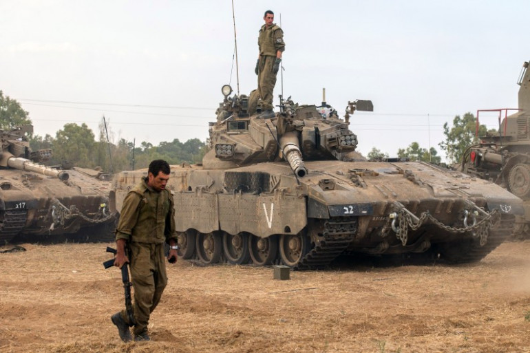 Des soldats israéliens à proximité d'un tank Merkava, le 19 juillet 2014 près de la frontière avec la bande de Gaza