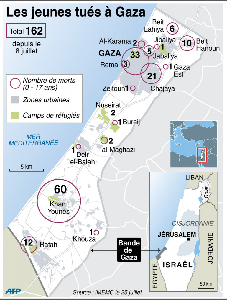 Carte de la bande de Gaza avec le nombre de victimes âgées de moins de 18 ans depuis le 8 juillet