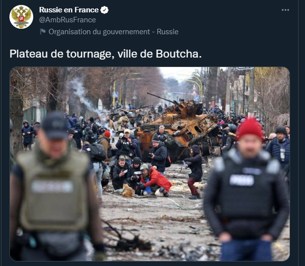 C'est un tweet qui ne passe pas. Jeudi 7 avril, Paris a convoqué l'Ambassadeur de Russie après sa communication "indécente" sur les exactions à Boutcha. Un tweet depuis retiré, et sur lequel on pouvait voir une photographie de plusieurs journalistes présents à Boutcha avec ce commentaire : "Plateau de tournage".