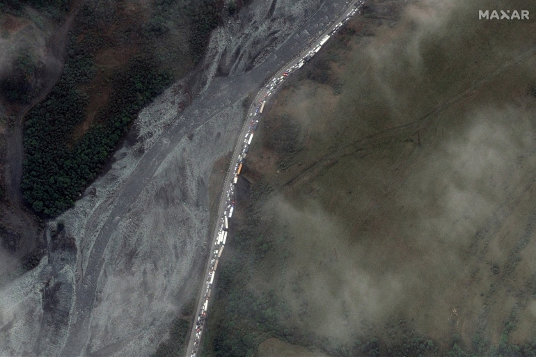 Image satellite prise le 25 septembre 2022 montrant des embouteillages près de la frontière russe avec la Géorgie.
