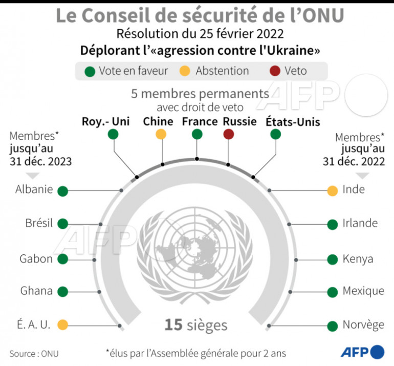 Sur les 15 membres du Conseil, 11 pays ont voté en faveur du texte, 3 se sont abstenus : Chine, Inde et Emirats arabes unis. Pékin a affirmé être contre la prise de sanctions qui pleuvent sur la Russie, Inde et Emirats n'ont pas expliqué clairement leur abstention.