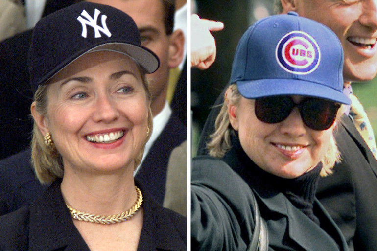 Hillary Clinton avec les casquettes de deux équipes différentes de base-ball