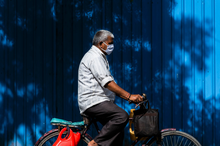 Un homme à vélo à New Delhi pendant les fortes chaleurs