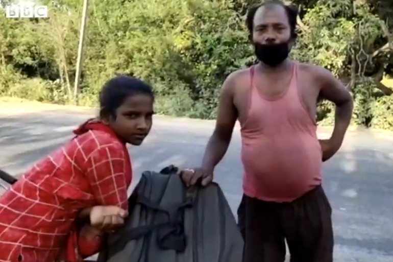 Jyoti Kumari achète alors un vélo de ville fuchsia, avec un petit panier à l'avant, pour une vingtaine d'euros. Son père, chauffeur de taxi handicapé ne peut pas pédaler, elle doit donc assurer seule les 1.200 kilomètres du chemin retour avec son père et une valise sur le porte-bagages. Vêtue de rouge, un petit anneau dans le nez, elle raconte son histoire à la BBC indienne. Elle explique qu'en voyant à la télé des gens rentrer à vélo, elle a eu la même idée.
