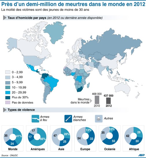 Il y a eu 437.000 meurtres en 2012, selon l'Office des Nations unies contre la drogue et le crime (ONUDC). C'est environ 30.0000 de moins qu'en 2010, année où cette organisation a mené sa première étude mondiale sur les homicides.