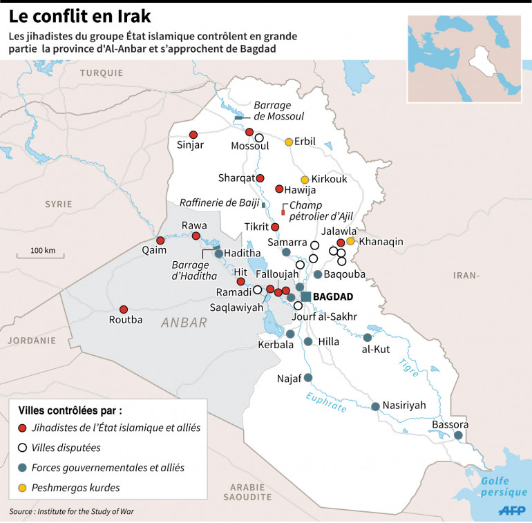 Carte des villes d'Irak contrôlées par le groupe de l'État islamique, les kurdes peshmergas et les forces gouvernementales.