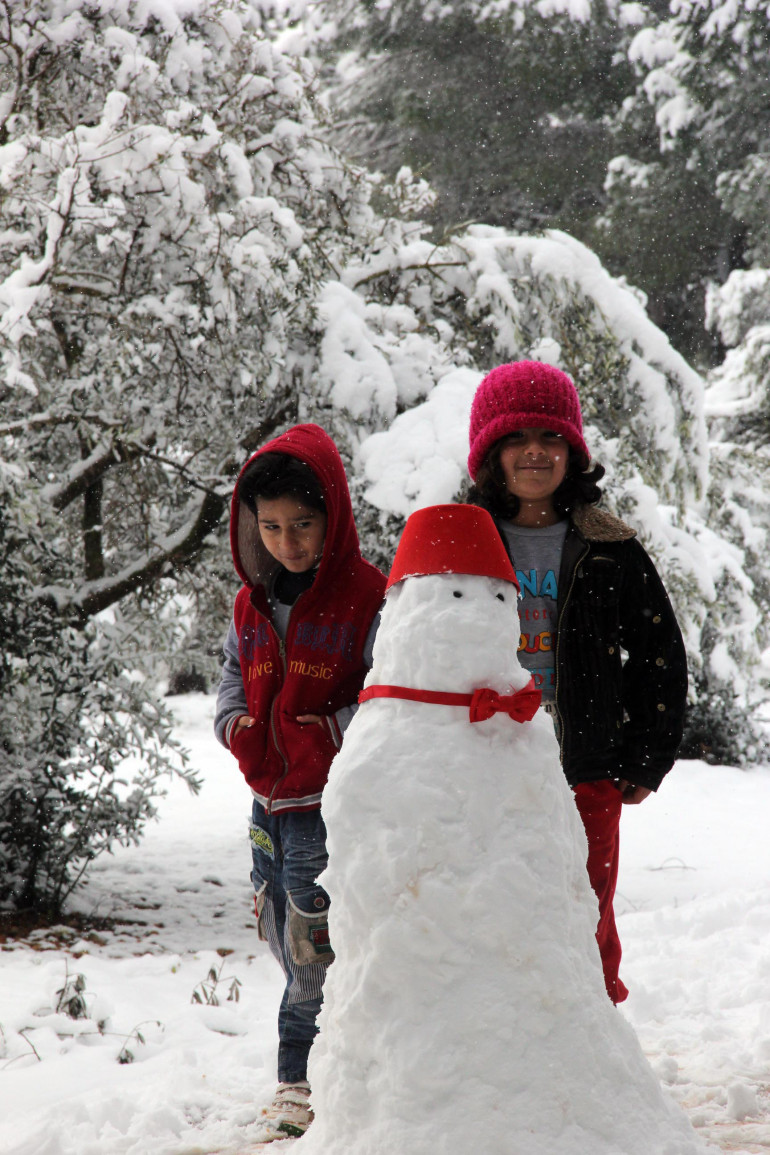 Deux enfants syriens du camp de réfugiés de Marj El-Khokh, près de la ville de Marjayoun, au Liban, ont fabriqué un bonhomme de neige