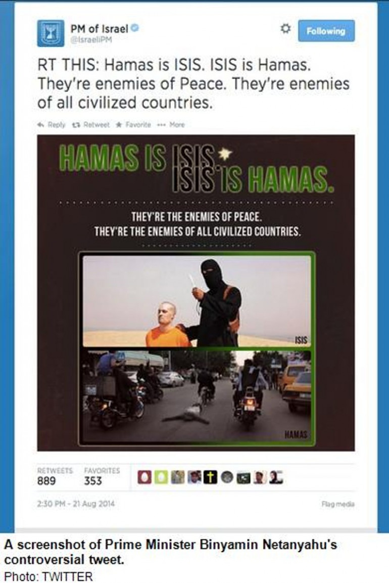 "Le Hamas est l'EI. L'EI est le Hamas. Ils sont les ennemis de tous les pays civilisés", c'est ce qu'a écrit le Premier ministre Benjamin Netanyahu dans un tweet associé à la photo de l'exécution de James Foley, et d'une autre image, montrant des combattants du Hamas traînant le corps d'un homme exécuté pour "collaboration" avec Israël.