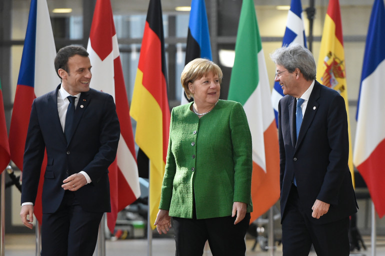 Emmanuel Macron, Angela Merkel et le premier ministre italien Paolo Gentiloni.