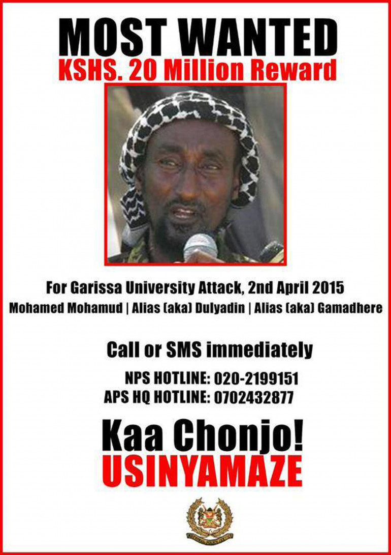 Vendredi, les shebab ont menacé le Kenya de nouvelles attaques, affirmant que celle de Garissa avait été menée en représailles de "persécutions systématiques contre les musulmans du Kenya". De nombreuses récompenses ont été offertes en échange d'informations permettant de localiser des commandants shebab. Souvent bien supérieures à celle proposée pour Mohamed Mohamud, et offertes par Washington, elles ont plusieurs fois débouché sur des frappes de drones américaines destinées à les assassiner.