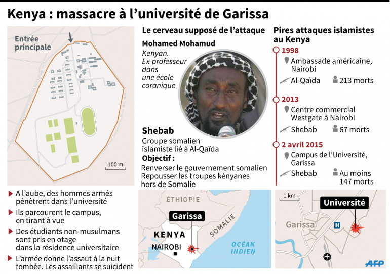 L'enquête des autorités kényanes avance à la suite de l'attaque de l'université de Garissa, qui a fait 148 morts. Mohamed Mohamud, soupçonné d'en être le cerveau, est un ex-enseignant kényan présenté comme "tranquille" avant sa radicalisation. Egalement connu sous les pseudonymes de "Kuno", "Dulyadin" ("l'homme aux bras longs") et "Gamadhere" ("l'ambidextre"), Mohamed Mohamud, membre présumé du mouvement islamiste shebab qui a revendiqué le massacre, est aussi recherché pour une série d'autres raids perpétrés en 2014 dans le Nord-Est kényan frontalier de la Somalie.