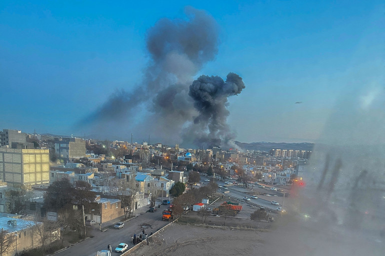 Des panaches de fumée s'élèvent après les explosions survenues à Tabriz, en Iran, le 1er mars 2026