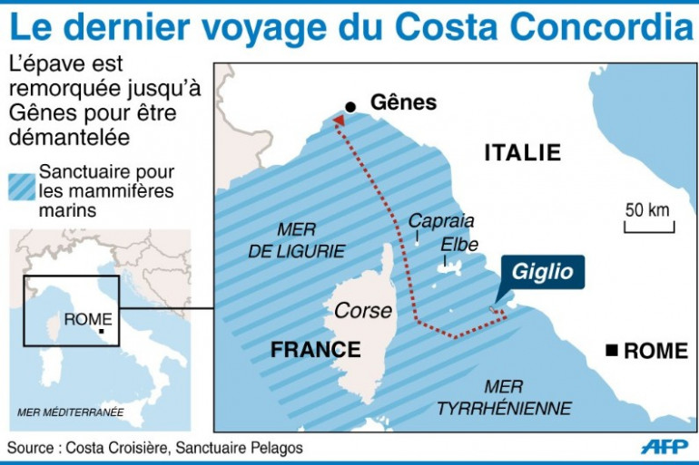 Le Concordia avait quitté mercredi l'île toscane du Giglio, où il se trouvait depuis l'accident survenu dans la nuit du 13 janvier 2012 alors que 4.200 personnes se trouvaient à son bord.