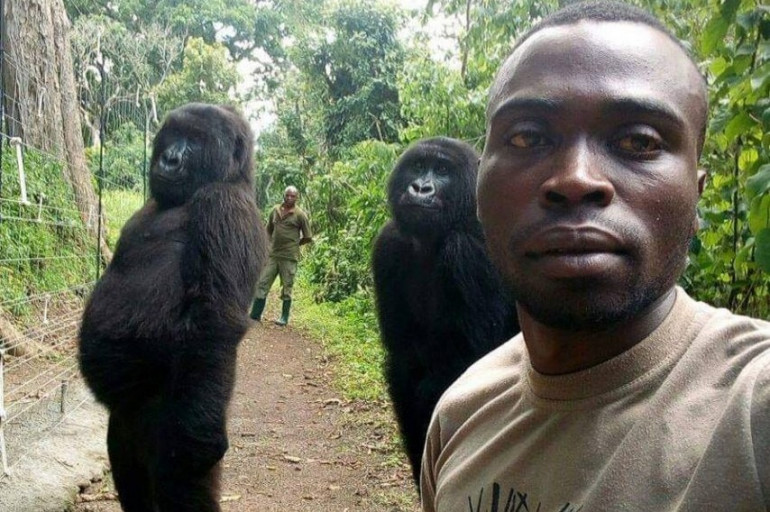"Une journée comme une autre au travail." C'est la légende de ce selfie pris par un ranger du Parc National des Virunga en République Démocratique du Congo. Nous sommes en pleine forêt, dans le centre des gorilles orphelins le 18 avril dernier. Mathieu Shamavu prend la pose avec derrière lui deux gorilles des montagnes qui se tiennent debout. On dirait même qu'ils ont les mains dans les poches. Poilus et bedonnants, les deux primates regardent tranquillement l'objectif.