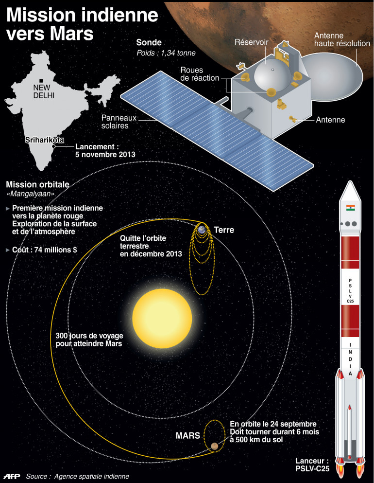 Elle a été conçue et produite en un temps record et avec un budget réduit, l'Inde parvenant comme elle l'espérait à devenir le premier pays d'Asie à atteindre Mars. Seuls les Etats-Unis, la Russie et l'Europe ont réussi dans cette entreprise jusque-là.