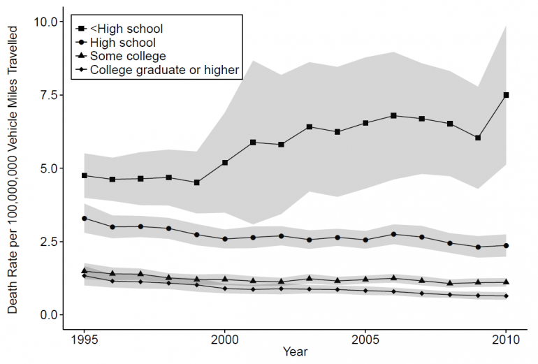 Partant de l'idée que les moins diplômés sont susceptible d'être moins riches et que les plus diplômés bénéficieraient de ressources plus importantes, les auteurs avancent différents facteurs qui provoqueraient cette inégalité. Le nombre d'accidents de la route et de décès ont baissé aux États-Unis. Cependant, l'étude suggère que la plus importante baisse du taux de décès vient des milieux les plus éduqués. En revanche, le taux augmente chez les personnes non diplomées sur la même période.