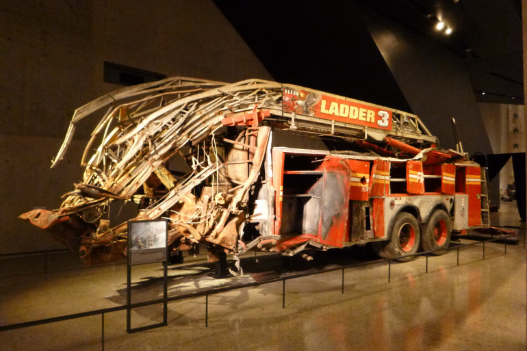 Avant intact, arrière broyé. Le camion de pompier a été conservé pour témoigner de la puissance de l'effondrement des tours