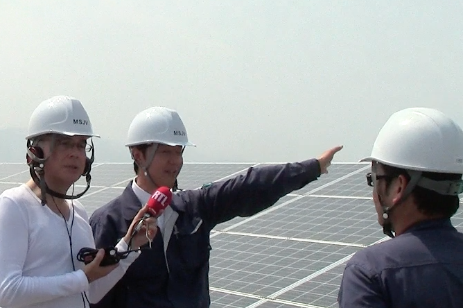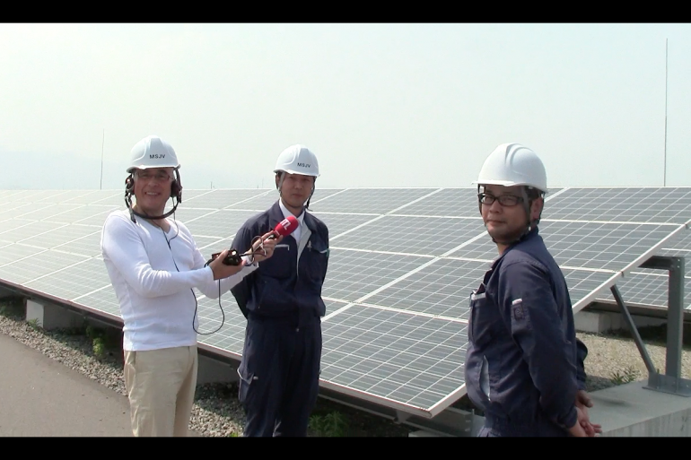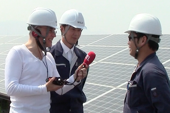 Joël Legendre, correspondant de RTL au Japon, sur le site solaire de Kagoshima, avec deux ingénieurs