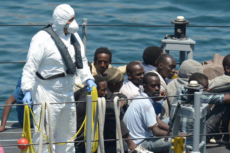 Des migrants à bord d'un bateau militaire au large de La Valette, à Malte, en juillet 2014 (archives).