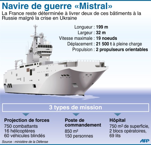 Selon L'Élysée, les conditions pour que la France autorise la livraison du premier des deux navires de guerre Mistral à la Russie "ne sont pas à ce jour réunies" compte tenu de l'aggravation de la situation en Ukraine. La France a "entendu la pression de la communauté internationale" en pleine crise ukrainienne et a décidé de suspendre "jusqu'en novembre" la livraison de ce premier porte-hélicoptères, selon une source diplomatique française.