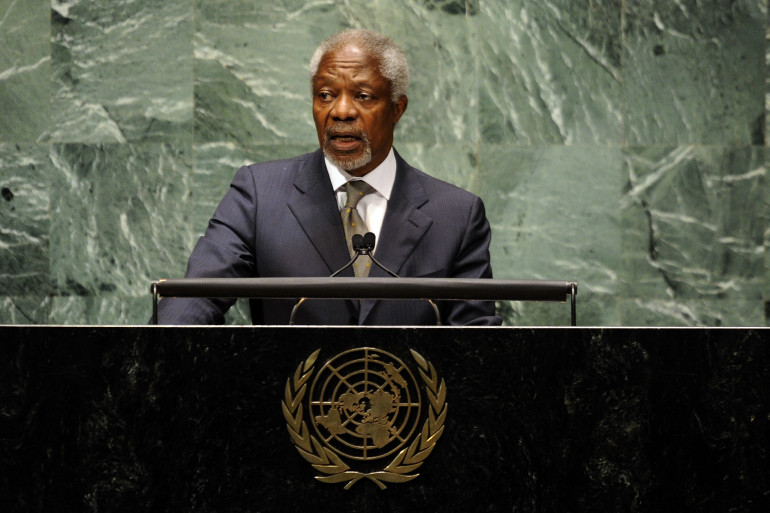 En février 2012, l'ancien secrétaire général est choisi par l'organisation et par la Ligue arabe pour une médiation dans la guerre en Syrie. Il abandonne après cinq mois, constatant un échec de la mission. L'heure alors pour Kofi Annan de quitter les Nations unies, après 50 ans de carrière à tenter de "guider vers le bien".