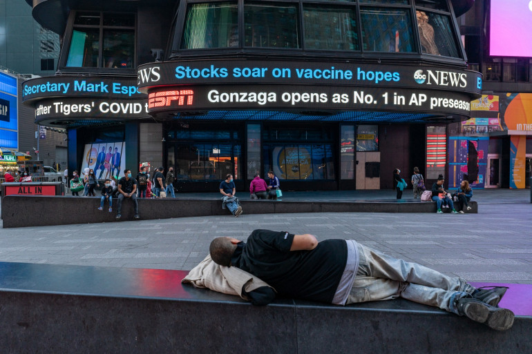 Un sans abris dans le quartier de Times Square à New York, en novembre 2020