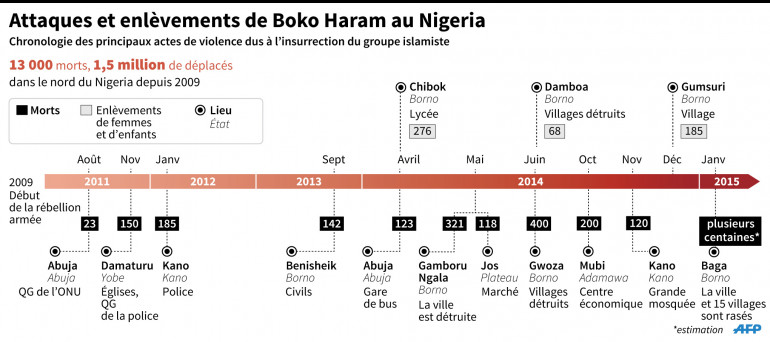 Chronologie des principales attaques, lieu, bilan causés par Boko Haram depuis 2009.