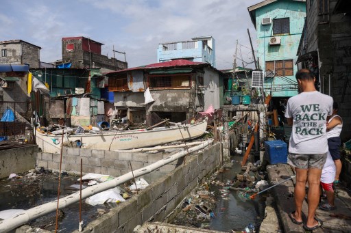 Une pirogue de pêche a été emportée au large et a percuté une maison, à Manille aux Philippines, le 10 novembre 2025.