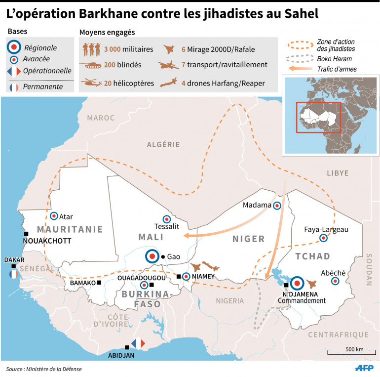 Plus de 3.000 militaires français sont déployés sur cinq pays de la bande sahélo-saharienne (Mauritanie, Mali, Tchad, Niger et Burkina-Faso) où ils combattent les groupes islamo-mafieux qui se jouent des frontières et déstabilisent la région.