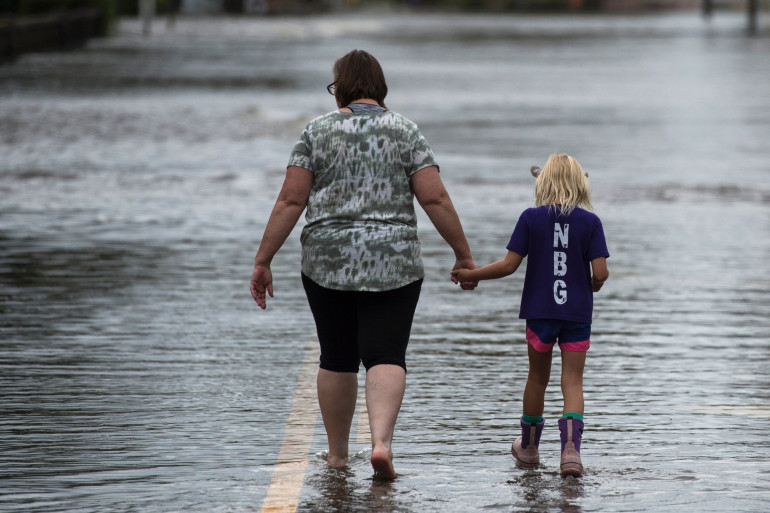 Des habitants arpentent une rue inondée de Pollocksville (Caroline du Nord) après le passage de l'ouragan Florence, le 16 septembre 2018