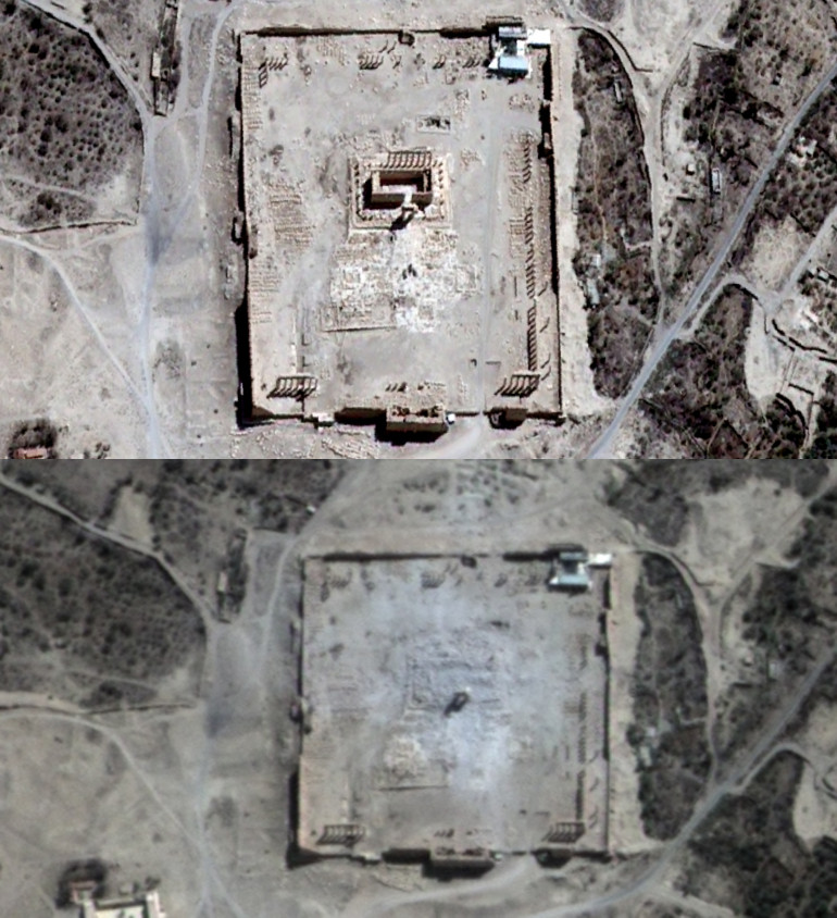 Sur une image datée du 27 août, une structure rectangulaire entourée de colonnes est clairement visible, alors que sur un autre cliché pris lundi, on ne distingue plus que quelques colonnes, en bordure du site classé par l'Unesco au patrimoine mondial de l'Humanité.